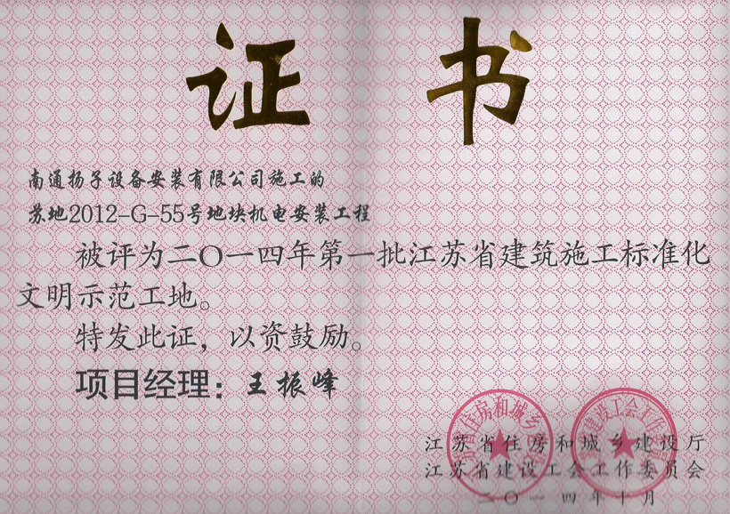 蘇地2012-G-55號地塊機電安裝工程被評為2014年第一批省建筑施工標準化文明示范工地證書